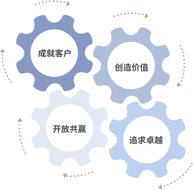 成就客户是一切决策的出发点,,,创造价值是衡量所有工作的标准,,,追求卓越是我们做事做人的态度,,开放共赢是我们的格局也是最终的结果。。价值观的齿轮环环相扣,,,推动着组织里的每个人不断向前。。。
